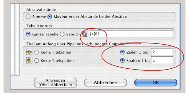 How these title rows and title columns take effect becomes clear in Fig. 2.81. On a double-sided layout, the container of the left page was connected to that of the right page via a horizontal pipeline. The container of the left page was also connected to the container on the left following page – and this in turn to the one on the adjacent right page. Title rows (or title columns) are repeated on all pages, while the continuation of the spreadsheet is displayed afterwards.