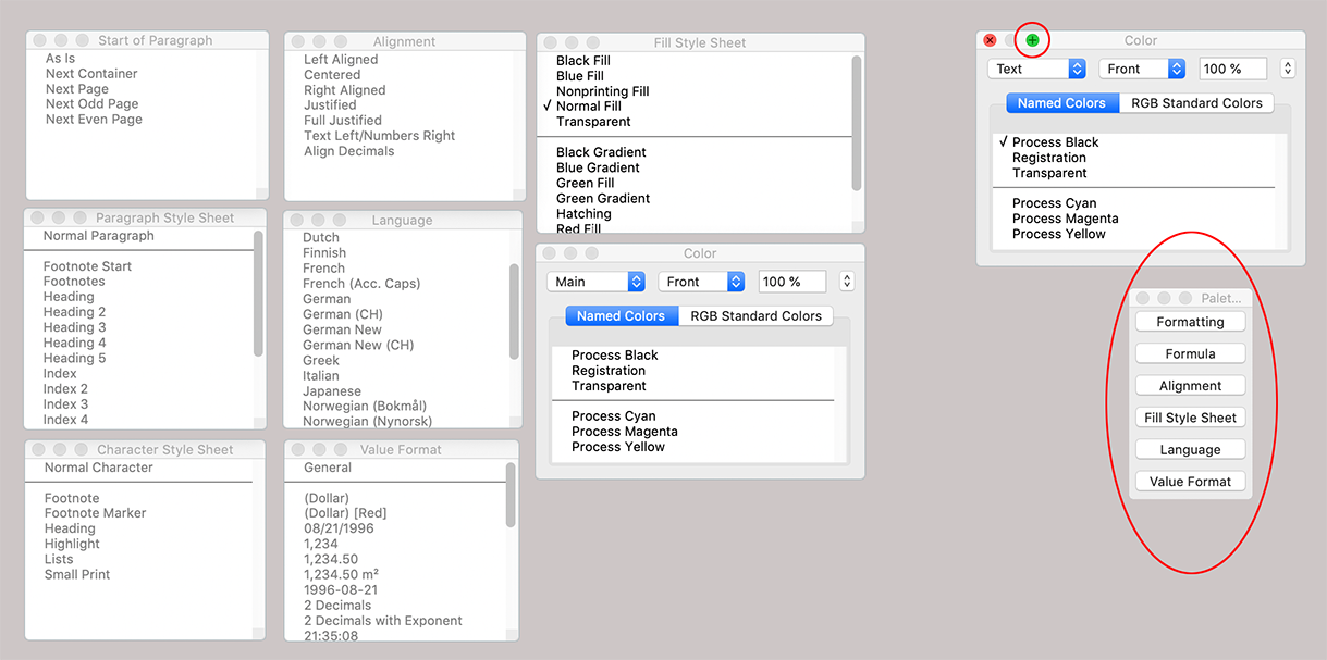 RagTime allows tearing off submenus under various pop-up menus. This turns the submenus into palettes that can be kept on the workspace to have permanent and quick access to their functions. Tearing off occurs when you drag the pointer beyond the edge of the menu area with the mouse button pressed (to the right, up, or down). In Fig. 2.45, those tear-off palettes are compiled that are available under the menu «Format». You can change the size and position of the individual palettes.