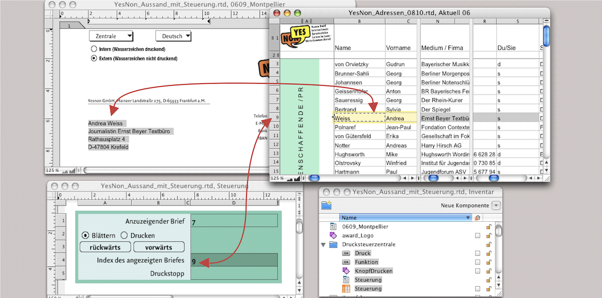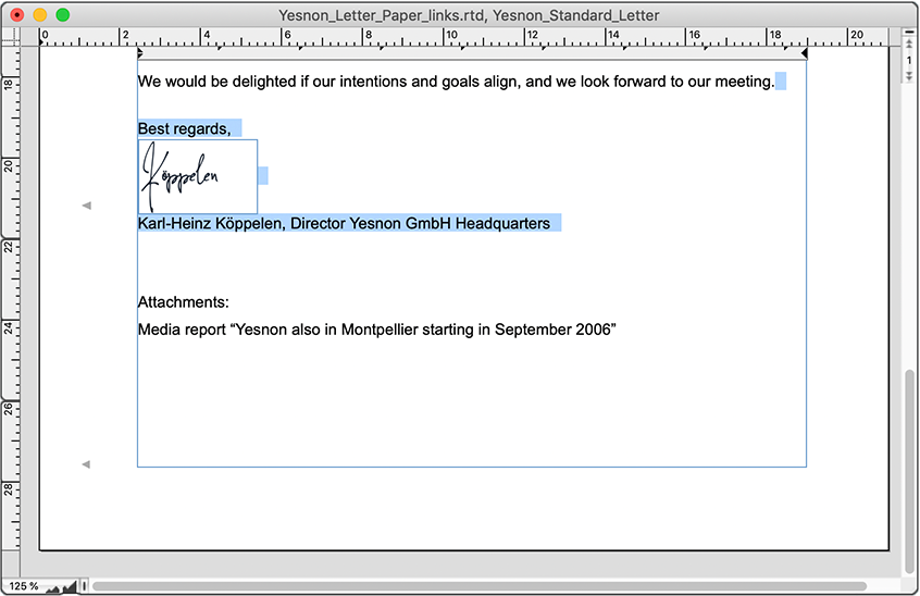 In the example of the YesNon language school's media mailing, further special features are worth mentioning. The director's signature was scanned and built in as a flowing picture component in the text. Understandable that our director does not want to sign two hundred letters by hand. The signature will look like the original at first glance on a good PostScript printer. More about flowing picture components can be found in Chapter 3.8 “Flowing elements”.