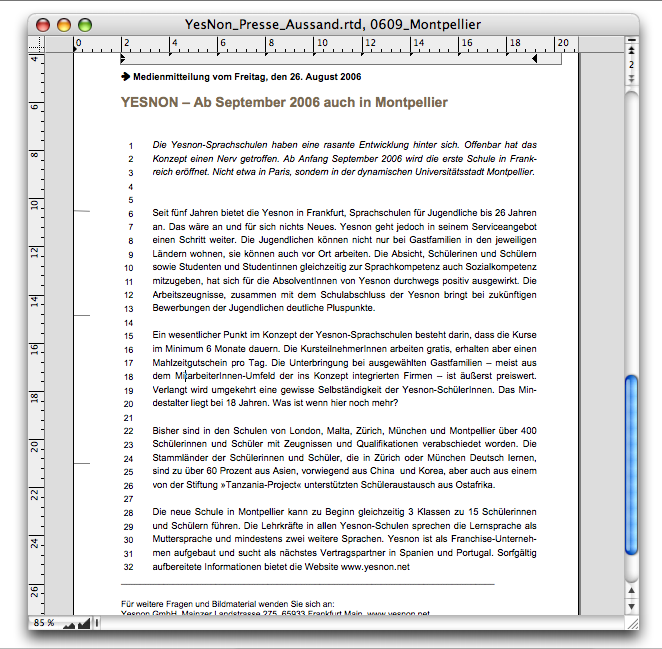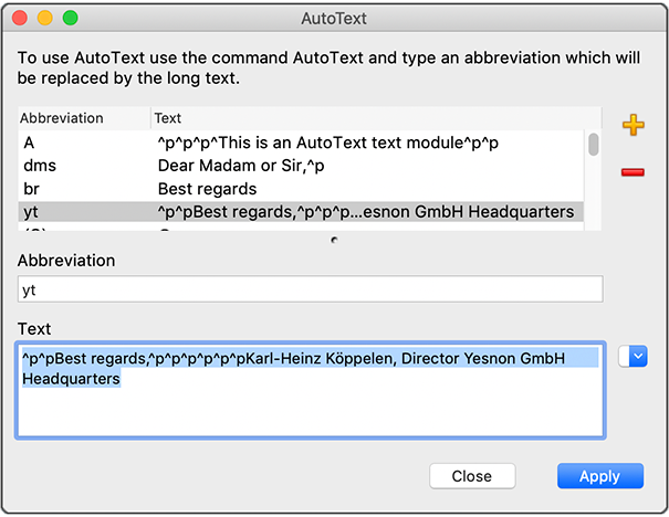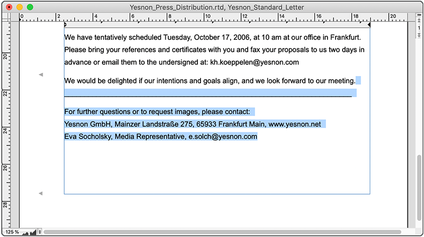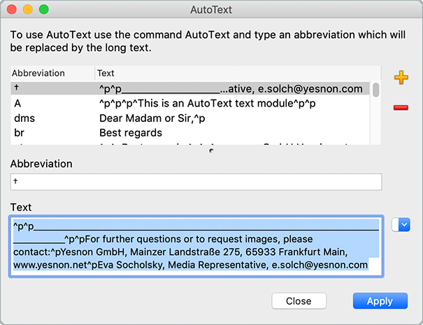 Under «Edit», there are the two functions «AutoText» (A'/c) and «AutoText Settings…» (A“'/6c). If you open the settings, you will see in the AutoText window already a series of characters and text blocks that you can use with the corresponding shortcuts (see Fig. 2.39). More interesting, however, are your own text blocks that you can enter together with a self-chosen shortcut. In the example of our YesNon media mailing, on the one hand, the sender of the director on the letter (see Fig. 2.43) and the footer of the media text with the person responsible for media contacts consist of AutoText blocks (see Fig. 2.44).