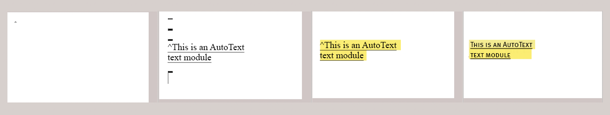 To insert a text block already stored in AutoText into your running text, press A'/c as prefix, an insertion mark appears (Fig. 2.40), then enter your shortcut for the text block. This inserts the requested text, but until confirmation with < or T, it is displayed underlined (Fig. 2.40/2). Simply continue writing in your normal text. The inserted text is now completely independent of the AutoText, i.e. you can edit and format it like a normally entered text (see Fig. 2.40/3&4). The text blocks – these can be individual characters, abbreviations, words, or longer text passages – can be changed in AutoText at any time. However, changes in AutoText will not affect AutoText entries that have already been used in your documents. AutoText can be used everywhere you work with text, regardless of the type of component.