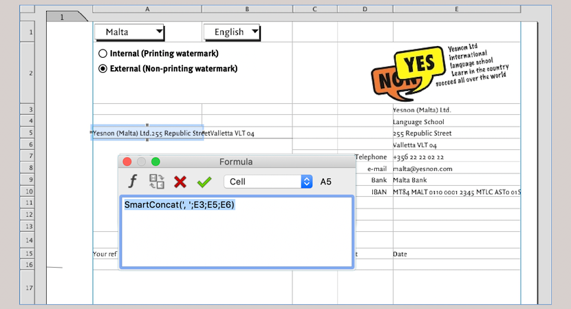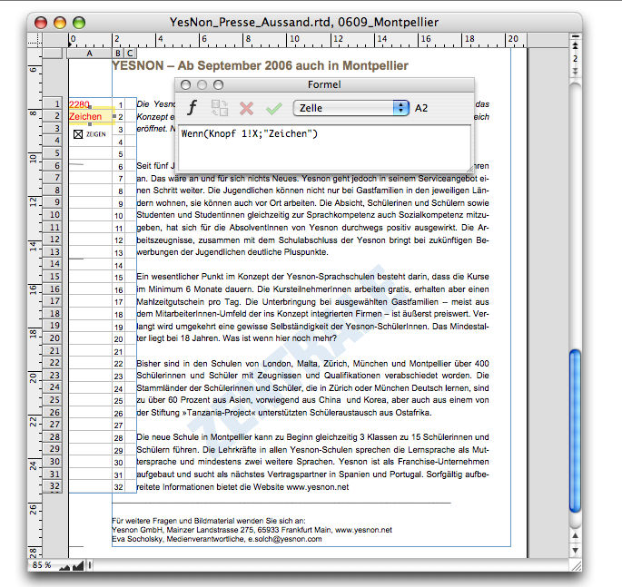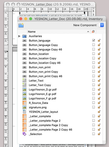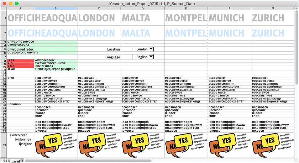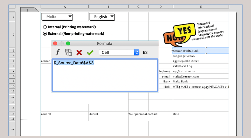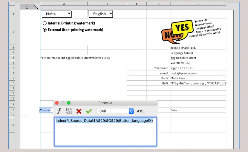 If you want to use the components created in this way for other purposes (e.g., to mark manuscript versions), you only need to change the terms in the first two lines of the spreadsheet «S_Source Data». Starting from our YesNon letterhead, we have placed the two buttons just described in cells A1 and A2 of the spreadsheet «_Total Letter». You can of course name your corresponding spreadsheet differently, e.g., «Watermark».