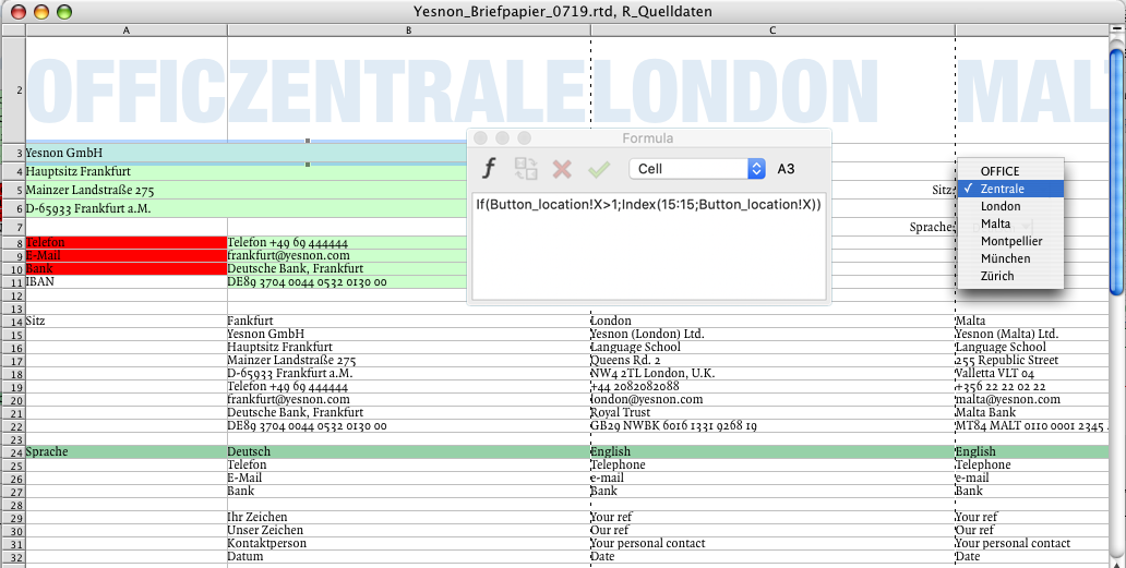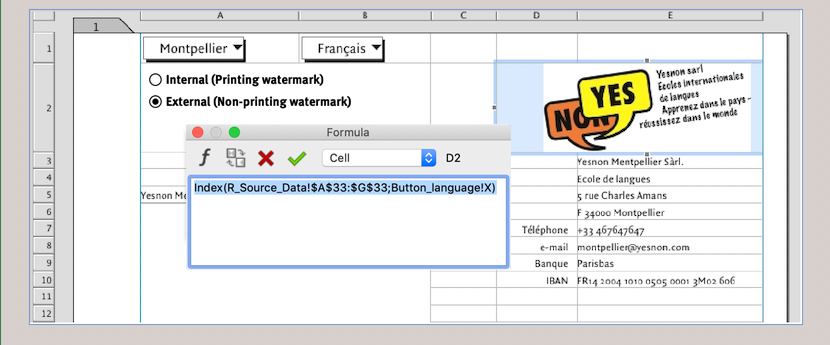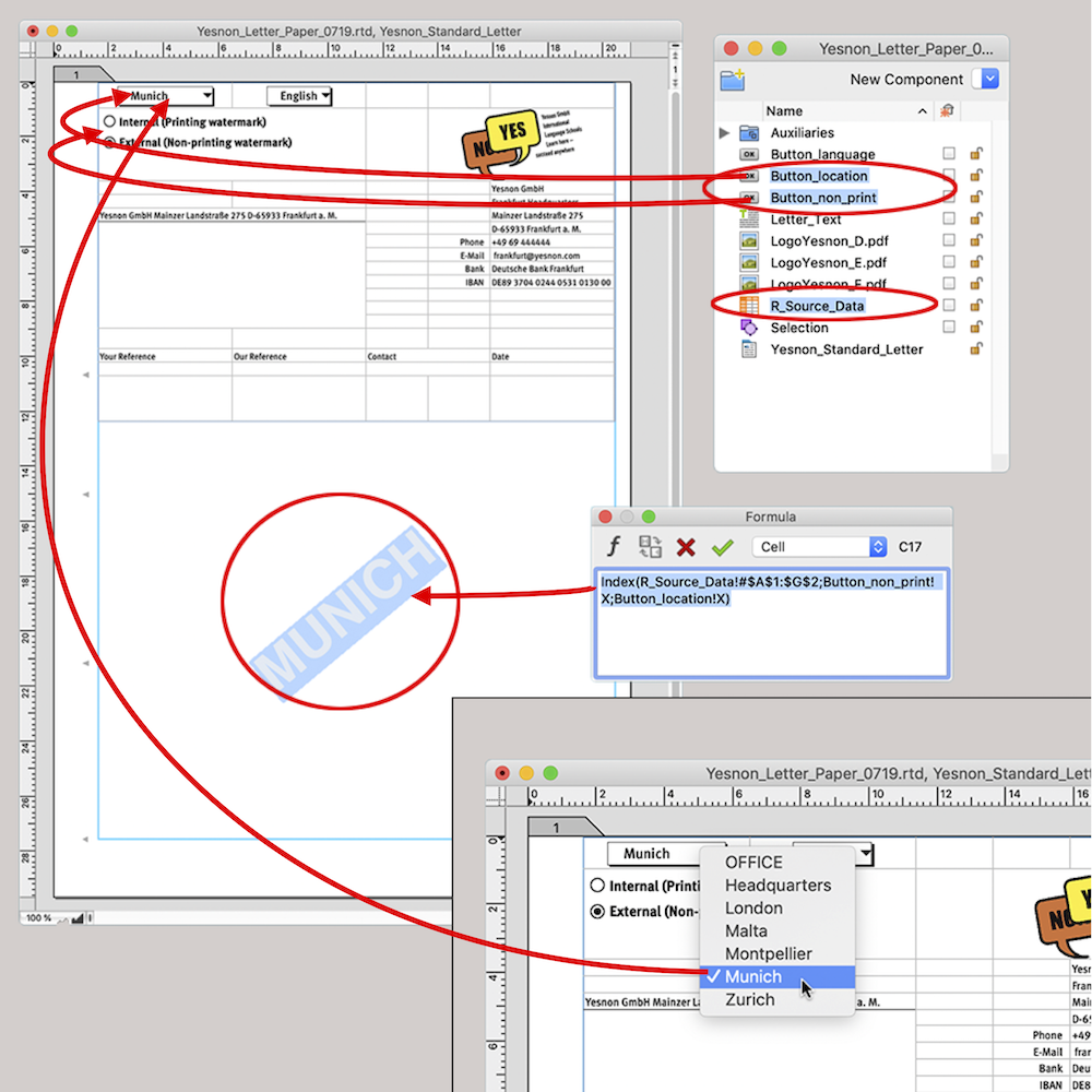 The button «Button_Location» controls the location designations in the watermark. To do this, it retrieves the corresponding terms in the already correctly formatted font from the spreadsheet «S_Source Data». The component that reproduces the watermark in the letterhead is a graphic text that merely contains a reference as a formula. The component was pulled large enough to be able to reproduce even the longest location name «MONTPELLIER» on one line. Rotating the component by -38° can also be done later. The formula to be entered is: