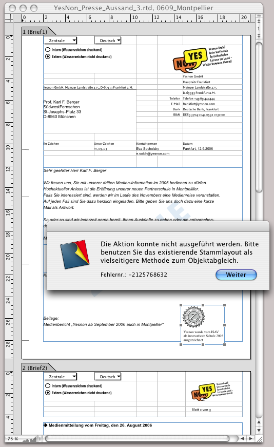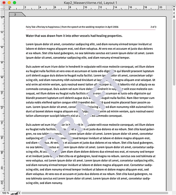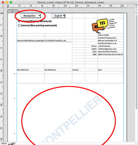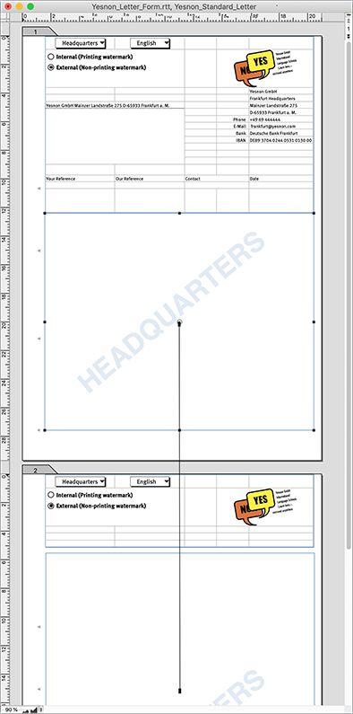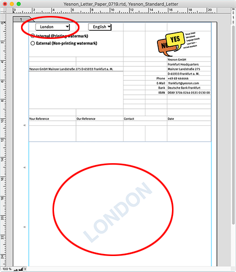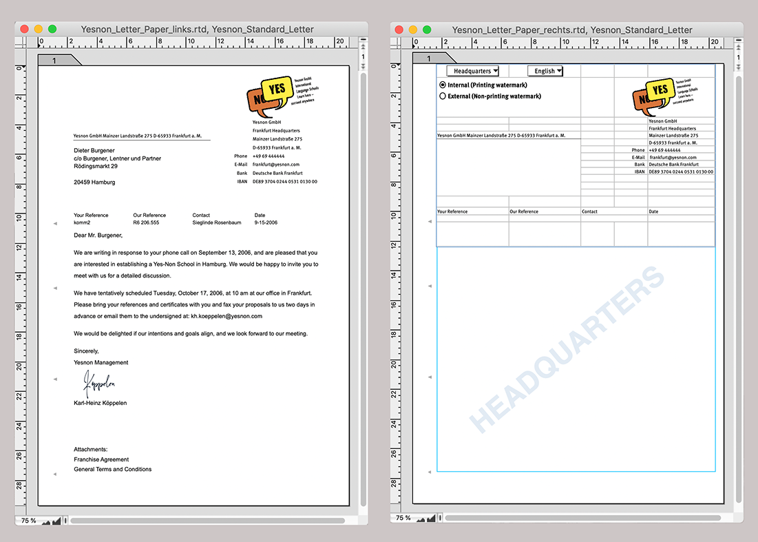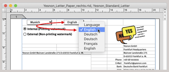 Let's go back to our document of the YesNon language schools. The watermark in the letter form changes depending on which school acts as the sender. At the same time, however, there are two watermarks: One that appears only in the document – as an internal identification mark when exchanging RagTime documents – and a second watermark that should also appear in the print and in the exchange of PDF documents (see Fig. 2.12/Fig. 2.13).