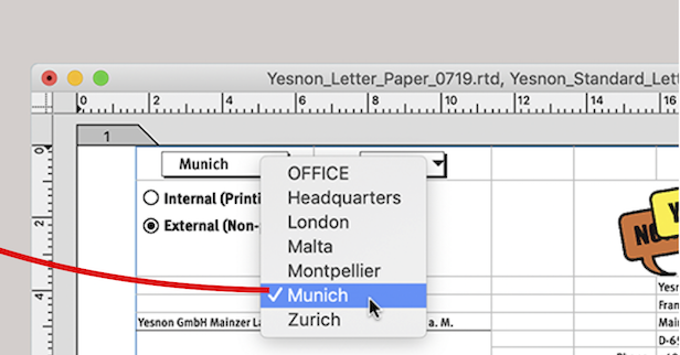 In this document, three things are particularly noticeable: First, the upper third is a spreadsheet (except for the fold marks), second, buttons are built in, and third, behind the text frame intended for the letter text, a watermark with the location designation «Head Offices» is visible. This watermark is linked to the first selection button and the radio buttons below it. This allows the user to specify at which location the document was created. Since such watermarks can be a great help in a wide variety of documents, we first turn to this function.