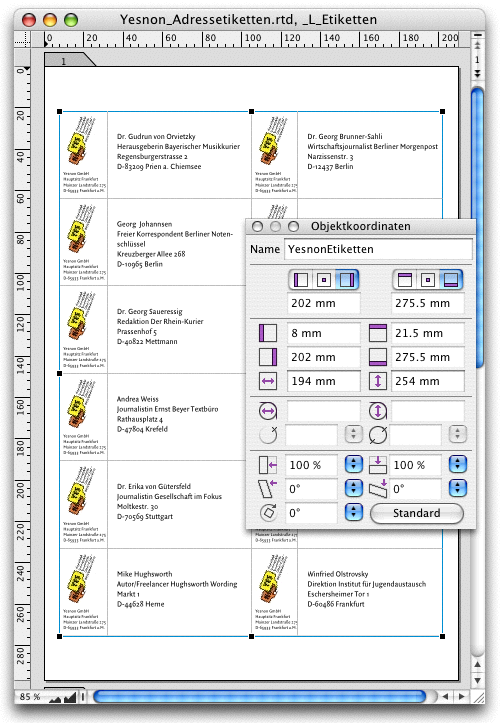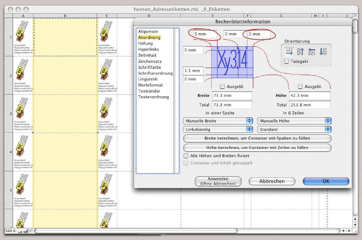 Headers are always advantageous when the spreadsheet contains so many rows that it is distributed over several pages in the layout. Then the header automatically appears on every page. In the example of the YesNon address list, the header also contains the logo in cell A1. Column 1, on the other hand, is used as a labeling column. Here, color fields and text labels on each layer make the address groups immediately visible. This form of address management also has its advantages and disadvantages. The advantage is that all addresses are accommodated in a single spreadsheet. The disadvantage: in all layouts, the column widths (and row heights) are exactly the same width or height. You can change the title designations (cf. Fig. 2.78 and Fig. 2.80), and the cells can be defined individually (components, unions, fill style sheets, character style sheets, etc.) but the grid of the spreadsheet changes on all planes if you change column width or row height in one plane.