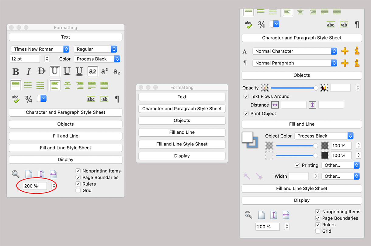 In addition to the actual formattings, the «Display» sector of this palette is particularly interesting. With it, the display size in the current window can be set “steplessly” as desired. There are direct commands to display the whole page in the window, the whole height, or the whole width. The quick showing and hiding of nonprinting items is just as practical as showing and hiding rulers, grids, or the gray displayed page boundaries that are not printable for the connected printer. If the formatting palette claims too much screen space for this comfort, or if the movement of the pointer to the formatting palette seems too cumbersome, there is always the possibility to create own keyboard shortcuts for the desired commands.