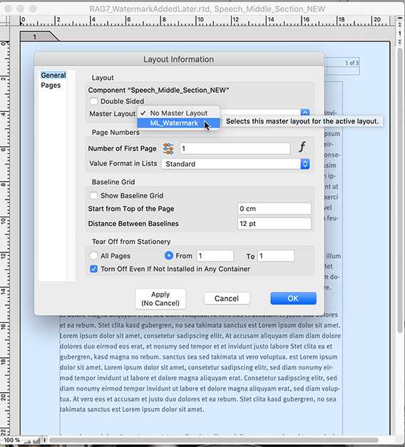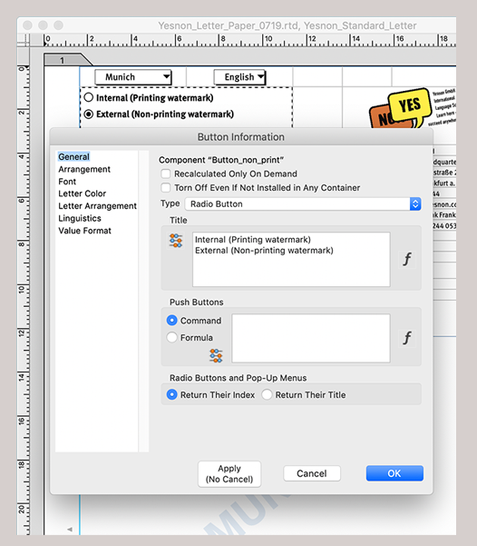 Your watermark combination now consists of a spreadsheet, in it a pop-up menu button with the terms for the watermark and a radio button with the selection whether printing or non-printing. In addition, you have a graphic text with the reference to the actual watermark and a spreadsheet with the source data that already contains the terms correctly formatted. If you now place the graphic text on a master layout page and also the spreadsheet with the buttons (as a non-printing object), then you always have the right watermark on every layout dependent on this master layout and can change it from any page with the help of the buttons (otherwise, elements dependent on the master layout can only be changed in it itself. The change then affects all pages of your layout.