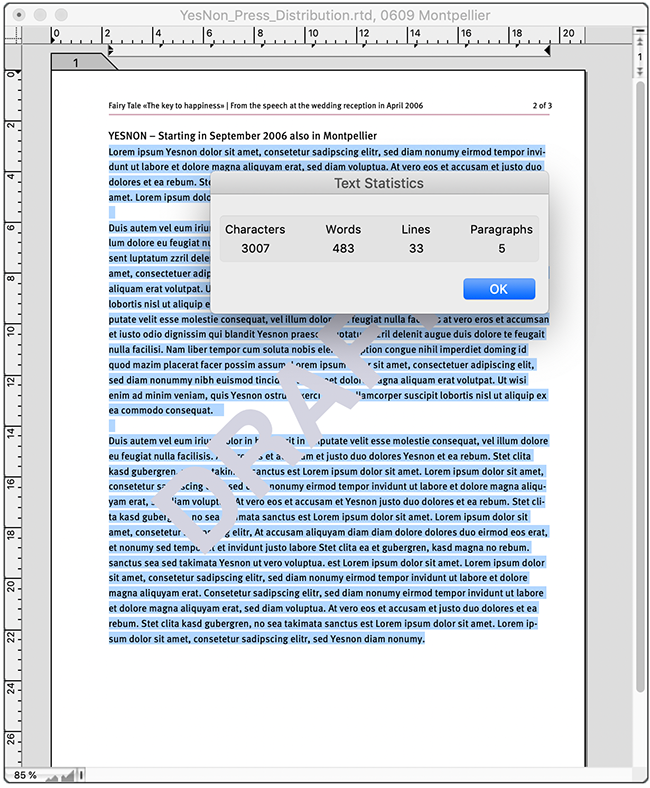 In media reports, or if you have to deliver articles for magazines and books, the desired text amount is usually specified. Then it says, for example: «A maximum of 2500 characters is desired.» In RagTime, you can simply check the text amount in text mode by selecting «Text ➝ Text Statistics…». The text statistics counts all letters, words, lines, and paragraphs in the current container. In the example of the media mailing, letter text and media text are on two pages, but contained in containers connected by a pipeline, thus in a single text component (see Fig. 2.27).