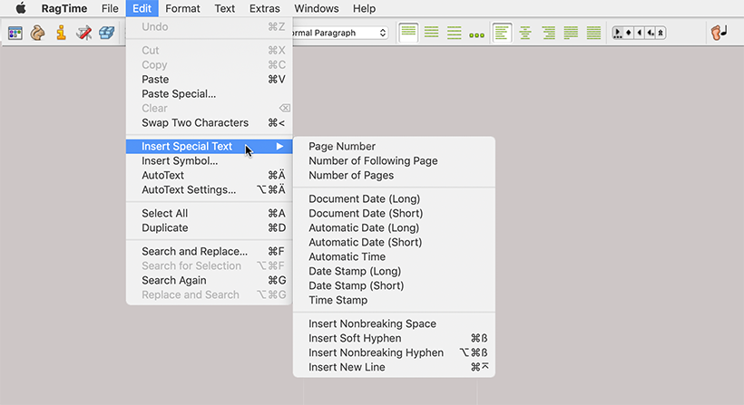 We started from the «Paragraph Break» to show some work facilitations that can mainly be used in text mode. For the example «Paragraph Break», the keyboard shortcuts in RagTime are just as practical as for the display commands mentioned in the last section. There are keyboard shortcuts for the most diverse commands and functions.