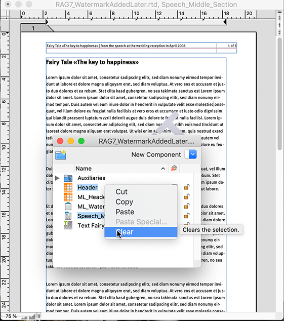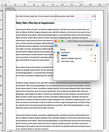 Fig. 2.6 shows the Inventory of the document, with the layout page in the background. The header as a spreadsheet, then the text component. In Fig. 2.7, it is visible that a new master layout has been created with the name «ML_Watermark». Select all components of the first layout page, e.g., with AA/6A, copy them and paste them into the master layout. The corresponding symbols and names of all copied components now appear in the Inventory. That shouldn't bother you: What is too much at the end can simply be deleted. Convert the text container on the master layout page: «Drawing ➝ Contents Type ➝ No Contents». This automatically deletes the copied text of this container. The empty frame still gets a pipeline for automatic page addition. Now enter the watermark text using the graphic text tool, rotate as desired, and set it to the rearmost plane (see Fig. 2.8). But attention: In the spreadsheet frame of the original layout, in cell B1 of the header, a formula for page numbering was entered. This no longer works with a master layout.