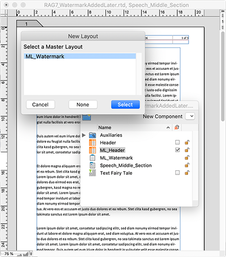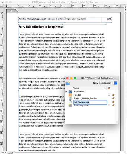There the same formula must be inserted as graphic text. In the illustration, this text is circled in red. Drag the graphic text with the formula to the right place and delete the formula at this place in the spreadsheet: The master layout is finished. Now create a new layout from the Inventory. A question will pop up asking if it should refer to the master layout «ML_Watermark». That's exactly what we want – and thus a new layout dependent on the master layout is created (see Fig. 2.9). After that, there is nothing more to do than to drag the text «Fairy Tale Text» from the Inventory into the newly created layout. There now exists a completely new layout that looks just like the original layout, but is additionally linked to a master layout that has a replaceable watermark. All unnecessary components – the old layout and the old header – can now be deleted in the Inventory. Make sure that no checkmark is set for the text component, otherwise the whole fairy tale might be deleted. In this case, without triggering another action beforehand, choose the undo command – and away with the checkmark!