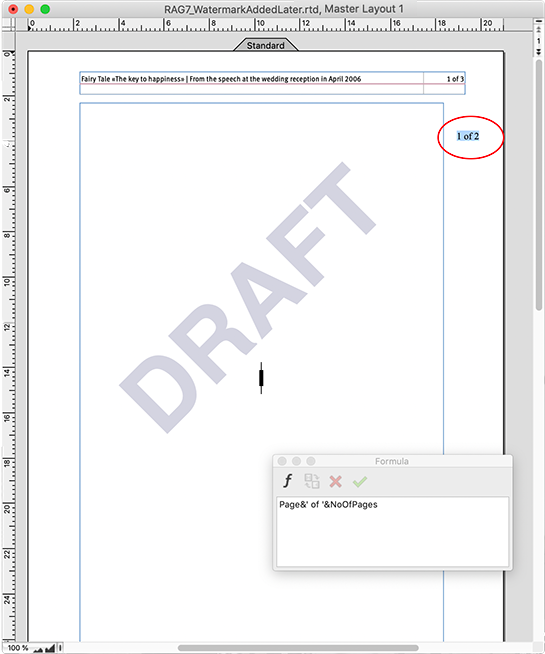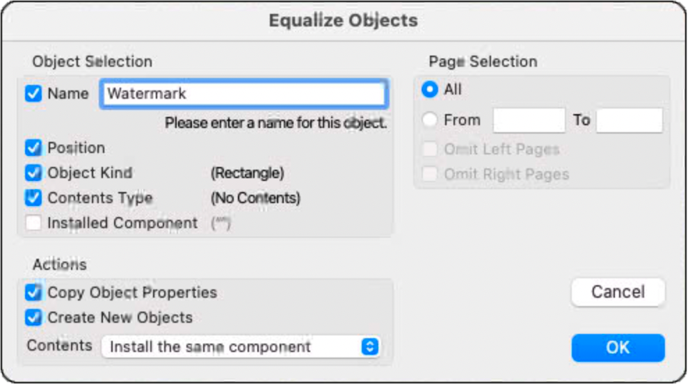 Sometimes the first solution is not really the best solution. As an exception, we have presented a very “spontaneous solution” to illustrate the system but it is not ideal in this case. The purpose of the «Equalize Objects» function is to either place individual components on several defined pages or to change them simultaneously. This is not suitable for variable texts, such as our watermark. We assume that the text of the watermark should change when a new version of the document content is created.