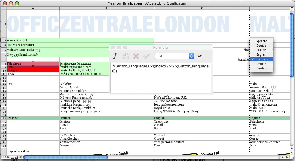 The signature characters and the logo, which differs in each language, in Fig. 2.25 and Fig. 2.26 refer back to the «R_Source data» spreadsheet with an index function and the pop-up menu button «Button_Language». Thus, a comfortable and user-friendly letter form has been created, which can be supplemented with a following page and saved as a RagTime stationery pad (with the ending «.rtt»). Let's stay with the topic of master layout in the next section – and with the difference to the form, which can also depend on a master layout.