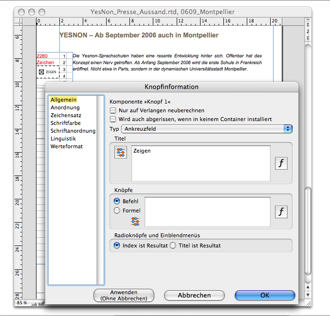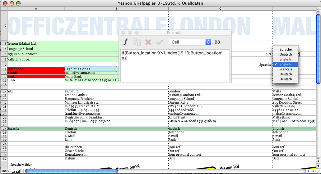 Let's return to our YesNon letterhead with the third button, the pop-up menu for language selection (Fig. 2.18). With it – together with «Button_Location» – the addresses, the reference notes, and the sender identification in the letter window should be exchanged. The same letter form is thus usable for all locations of the language school. This increases flexibility, as every user has all letter forms of the YesNon language school available at any time and can send letters on behalf of another school. The area of application of the solution shown here can be transferred, e.g., by switching a single form as letter, delivery note, invoice, reminder, etc. via pop-up menu. The principle remains the same.