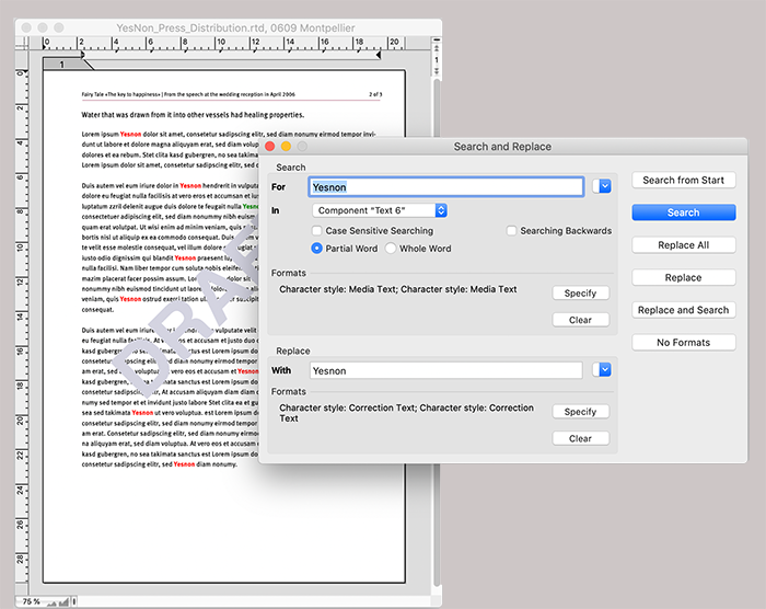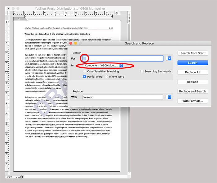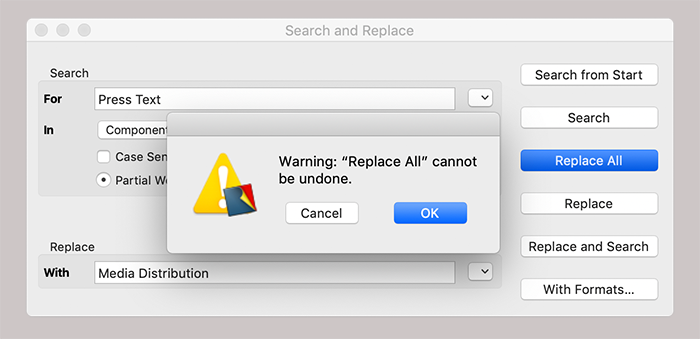 The function can be applied in one pass to a selected text area, an entire component, the entire layout, or even to all open documents (see red marking in Fig. 2.62). But attention: if you intend to press the button «Replace All», then it is important to check once more exactly what is selected under «In». If it says «Open Documents», for example, alarm bells should start ringing! Because the fatal thing is: «Replace All» cannot be undone.