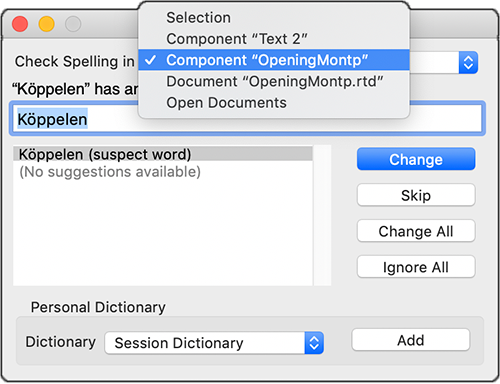 The spell check can refer to a selection, a component, a document, or all open documents. RagTime gives suggestions for unknown words, what might be meant or what is orthographically correct. Also repeating words that are close together are noted (see Fig. 2.49 and Fig. 2.50). The other functions of the spell check explain themselves. What the spell check does not show are hyphenations and, for example, double spaces. The «Check Spelling» window is, of course, linked to your dictionaries. Since RagTime 6, all dictionaries are supplied. Good about RagTime is that you can still create your own dictionaries: For the current correction run a «Session Dictionary», for your company one own (with spellings of your company name and industry terms) and also otherwise for all possible projects one each. These dictionaries do not have to lie in the RagTime folder like the RagTime dictionaries, but can be stored anywhere on your hard drive or on the server.