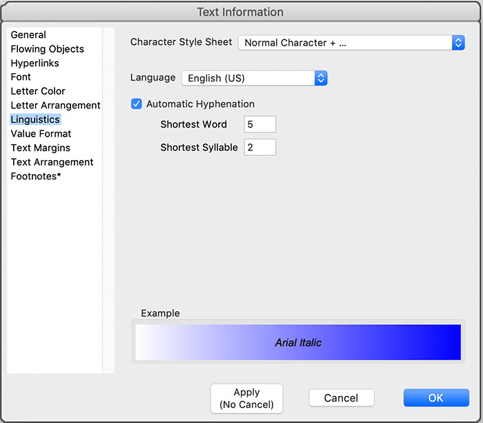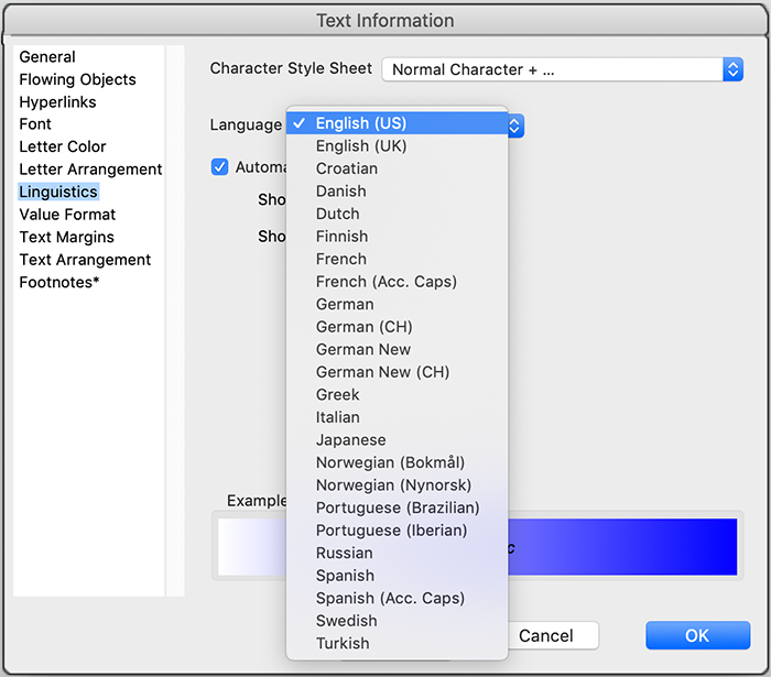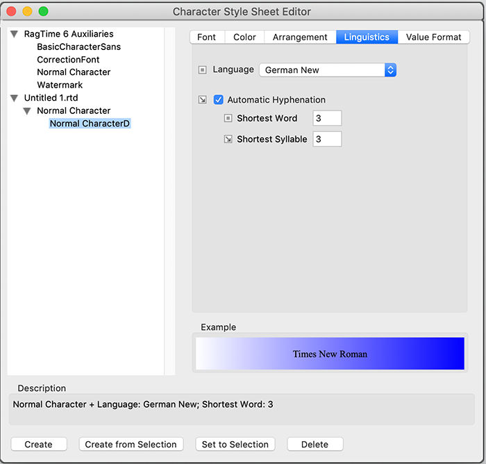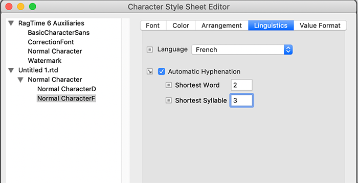 You can specify the conditions under which separations should be inserted in «Text ➝ Information ➝ Linguistics». In this panel (see Fig. 2.55), the hyphenation conditions for the automatic hyphenation can be set, or on the other hand, determine that no hyphenation should occur at all. With RagTime, however, you can influence hyphenations much more specifically: In the panel «Character Style Sheet Editor ➝ Linguistics», an inherited style sheet with a different linguistics can be created for each character style sheet. This means that in a single text, several dictionaries can be queried. Specifically: You assign to the English, French, or other language text parts in your text each an own, inherited character style sheet with the corresponding linguistics (see Fig. 2.53 to Fig. 2.56). Of course, you can also set for each font and language whether you want to suppress hyphenation in general (if «Automatic Hyphenation» is not selected). Under «Format ➝ Language», you can simply check which language or which dictionary is currently being used.