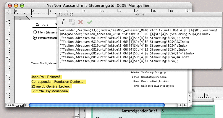 With the function «SmartConcat» the sender identification for the address window references the addresses. This allows several cell contents to be connected to a text that is strung together by certain recurring characters. In our case, that is a comma and a space (Fig. 2.24).