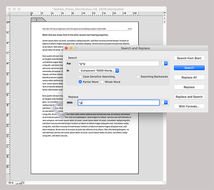 It is obvious that you can enter word parts, words, sentences, sentence parts, etc. with «Edit ➝ Search and Replace…», or AF/6F, and replace them with another text. Eliminating double paragraphs or spaces, removing or adding paragraphs and tabs, replacing normal hyphens with non-breaking hyphens, etc. are all part of the standard repertoire of the search/replace function.