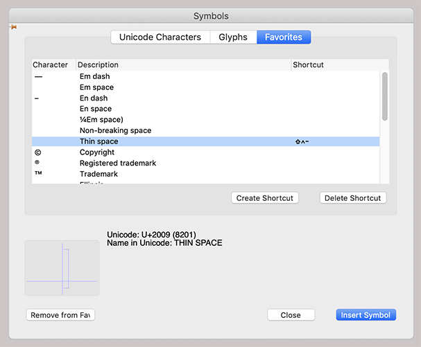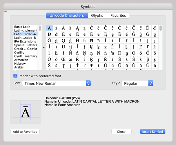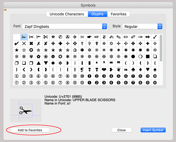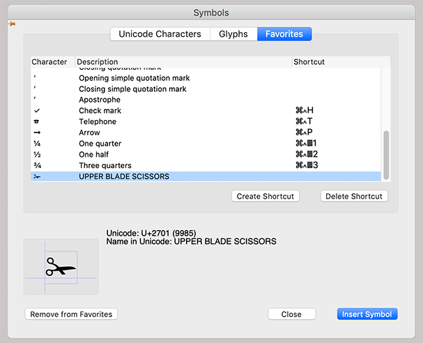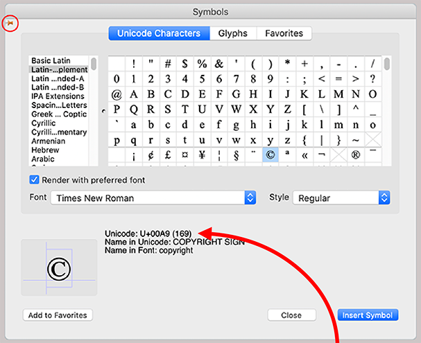 Finally, something useful that could be overlooked: The small pin in (Windows)/beneath (Mac) the title bar. If it is horizontal, the window must be closed again before you can continue writing in your text. If the pin is set vertically by selecting, the window can remain open while capturing text, and you can access the symbols, glyphs, and favorites again and again.