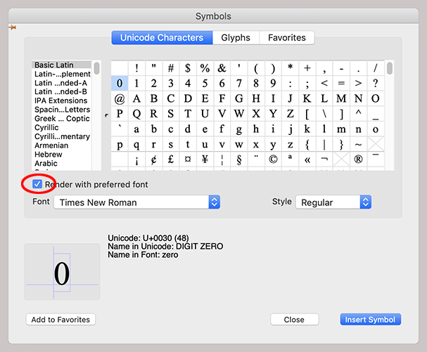 What makes «Insert Symbol» so interesting are two points: First, all characters can be inserted directly matching your currently selected font formatting. For this, the checkmark must be set (see red circle). Second, you can add all characters with «Add to Favorites» to the «Favorites» panel, where you can assign them a keyboard shortcut, thus a kind of «Alias» (Fig. 2.33, Fig. 2.34, Fig. 2.35).