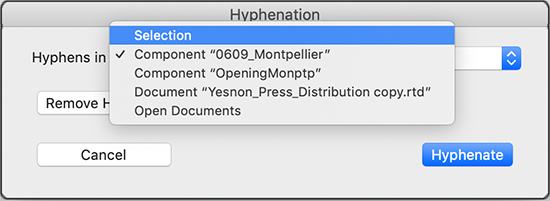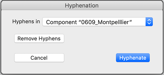 If you append a «=» to the end of a word instead, this word is fundamentally not hyphenated (see Fig. 2.52). Hyphenation is still possible at the end even if you had previously turned off automatic hyphenation: Under «Extras ➝ Hyphenate…», the component can be selected (see Fig. 2.57/Fig. 2.58), in which hyphenations should be made (or also removed). Conversely, if you want to retain hyphenations in imported texts, the setting in the window «Settings ➝ Text» applies.
