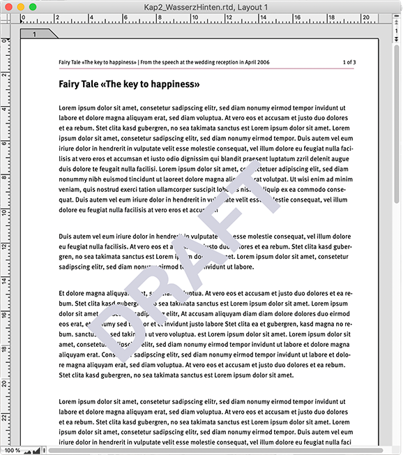 In long-term projects, there are often a lot of documents, and in several versions. Watermarks, possibly with dates, facilitate the overview. A simple watermark is built quite quickly: With the graphic text tool, write the desired text – in large font size and with light color or black and a tint of about 10%. Rotate the text line so that it runs diagonally across the page and then move the text element to the back («Drawing ➝ Stacking Order ➝ Send to the Back»). Draw a container over it, which is now on the front layer – and is usually defined as a text component in the layout. It must have a transparent fill style sheet. If it is a spreadsheet container, care must be taken that not only the container itself, but also the filling of the cells is set to «Transparent». With «Equalize Objects» (see Fig. 2.3), the element can be copied to all or the desired pages in one operation.