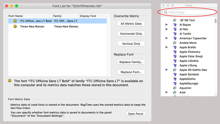 When we are on the topic of special characters, types, and fonts, for the sake of completeness, let's also call up the auxiliary «Fonts List» and the palette «Fonts» (Fig. 2.38). In addition to TrueType and PS Type1 fonts, RagTime now also fully supports OpenType fonts. The «Fonts» palette makes it easy to find the desired font on the computer. Entering some letters limits the list to those fonts whose names contain the entered letter sequence – not necessarily at the beginning of the name.