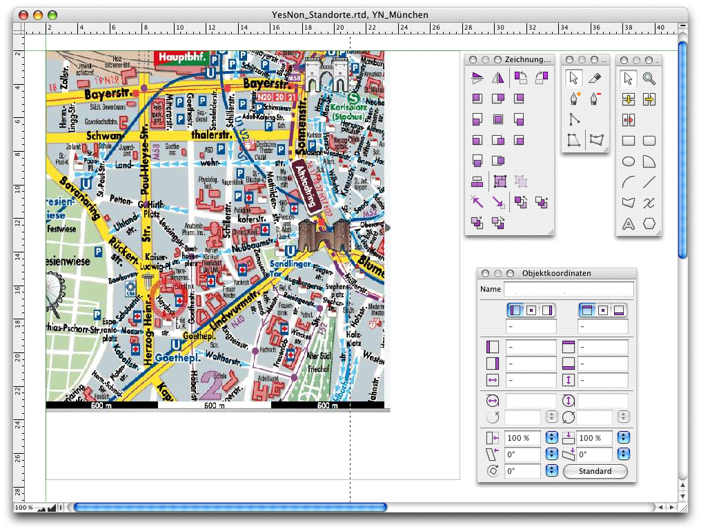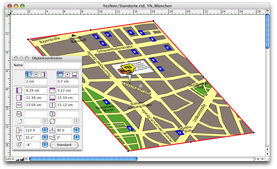 If you have placed the location map component in a layout, you can also rotate and shear it (see Fig. 2.136), i.e., distort it into a perspective dimension (ideally using entries in the «Object Coordinates» palette). The interesting thing about this option is that text and all drawn objects are distorted in the same way. However, if you open the drawing component in its own window, you will find all objects in it exactly as you drew them. So it is not the objects that change, but the component as a whole. Incidentally, this works in exactly the same way as with image components, which you can also shear and rotate without changing the actual image.