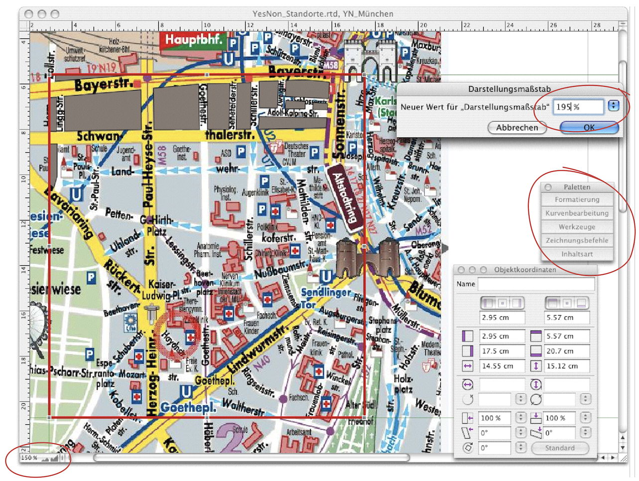 ● If you often work on drawings with RagTime, assign keyboard shortcuts to all important drawing commands. This makes your work much easier. ● In particular, adjusting the display size («Keyboard Shortcuts ➝ Window Commands ➝ Display Scale») in two or three percent increments should be one of your shortcuts. ● In the formatting palette, under «Display», you can also adjust the size, even with differentiated input and quick switching to page or window size. ● With the magnifying glass, you can zoom in on a specific area of your layout or drawing. ● The palette dock is a useful tool on the Mac for keeping important palettes quickly accessible. ● Be sure to check out the settings for scales, guides (magnetic), and background grid (magnetic possible) so you can work with them. ● To make polygons and other drawn objects quickly editable: double-click the line or select the object and press the </T key. Pressing the </T key again selects the drawing object as a whole. If you need an object in the layout or drawing a second time, drag it to the desired location with the mouse button and “/6 key pressed. ● Use the option to convert object types, e.g., to turn a rounded rectangle or oval into a speech bubble: Convert to a polygon or Bézier curve, insert points, and insert the wedge. ● Use the option of working with several transparent or semi-transparent containers on top of each other to “trace” something. ● You can select an object behind it using an empty, transparent frame. ● This can also be confusing if you cannot reach the desired object: Check which objects have a transparent fill. ● Use the drawing component as a collection container to display different elements together. The drawing container can then also be used for the “image section” of the elements. ● Always work consistently with color, fill, line, and font style sheets when creating drawings.