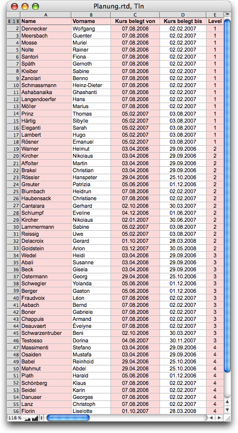 However, how you obtain the data is irrelevant for the planning we want to focus on here. So let's assume that the participant data is listed in the spreadsheet «Part» (short for «Participants») with the following information (see Fig. 2.146): in columns A and B, the last names and first names; in column C, the start date of the course; and in column D, the end date of the course. Finally, column E contains the course level. The table is sorted by course level («Level») and course start date. If a participant has booked two course modules, there will be two entries for them in the table.