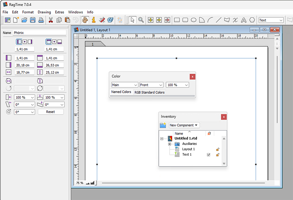 Under Windows, the palettes behave differently: A double-click on the title bar docks them at the window edge, but in full size. Another double-click makes them a freely movable palette again. Palettes can be reduced to a minimal size, little more than the title bar. However, there is no practical palette dock in Windows like there is in Mac. In Fig. 2.46, the object coordinates palette is docked – each palette has its fixed assigned side of the window where it is docked. The Inventory – under Windows also a kind of palette – and the color palette are free-floating, the latter reduced to minimal size.