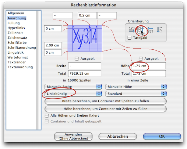 Select row 3 and open the info window again (see Fig. 2.140), enter «Left Aligned» for the horizontal alignment, 1.75 cm for the row height, and select the second option for the «Orientation» with text running from bottom to top. While row 3 is still selected, assign it a value format of «Weekday», which is defined as «DDDD».