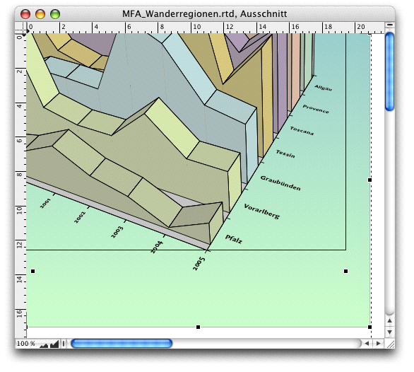 To be able to place the categories precisely, we will take a small intermediate step. Open a new drawing component, as we want to continue working with graphic text. Drag the graph you have created so far from the Inventory into the drawing component window. A tip: when working with RagTime graphs, save more often than usual (using «Save As»). This allows you to revert to previous documents if something goes wrong – or if RagTime crashes at the worst possible moment without warning, which can happen from time to time in the graph component.
