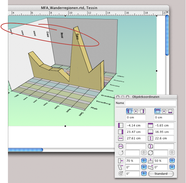To make the individual section stand out more clearly from the base graph, we have chosen to distort it. This graph is therefore displayed slightly wider. To do this, open the «Object Coordinates» palette and select the container border of the graph. Enter 70% for the width of the container and 50% for the height. We should check whether we also want to label the category axis in the third position. Since the years cannot be clearly assigned at the top of the graph in its current perspective, we decide not to do so.