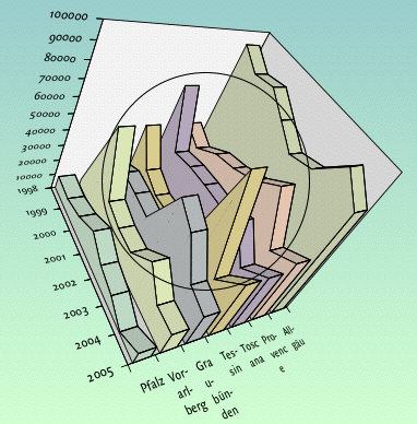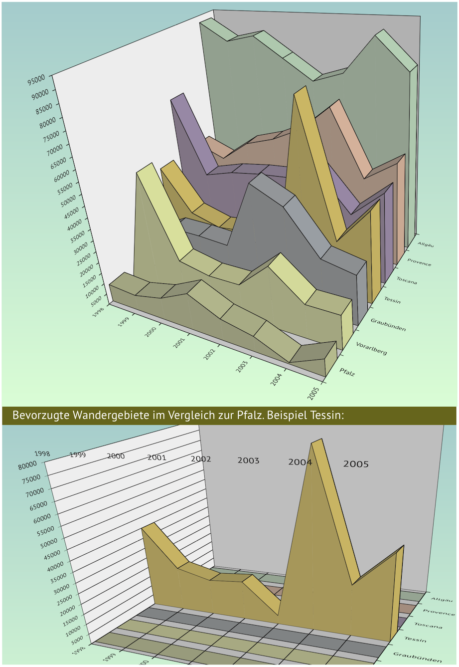 Under the menu item «Graph ➝ Gallery», a window opens where you can choose from over 150 standard chart types. Each of these chart types also offers numerous options for customization. The individual panels of the gallery are shown in the The famous population pyramid section. For the hiking region statistics, the 3D area chart was selected.