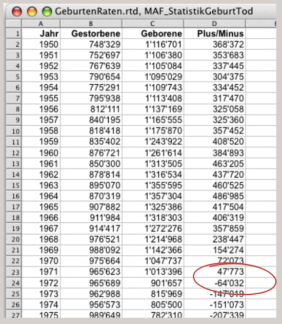 Under «Graph ➝ Axis ➝ y Axis» (Fig. 4.25 left), you can define the maximum/minimum values as well as the widths/spacing of the individual values. This allows you to make a graph more clear or “dramatic”. True to the motto “Don't trust any graph that you haven't dramatized yourself”, you can experiment with this and try out the effects. In any case, coloring serves to clarify or accentuate. In Fig. 4.25 right, the graphic is basically already finished. The following steps have already been changed here: the background has been given a transparent fill, the title has been written (click on «Title» and enter the desired text), and the entire graph has been slightly distorted in height (height 120%) using the «Object Coordinates» palette. Incidentally, the font and color formatting can be set in the same way as in any other RagTime component. To highlight the difference between birth surplus and birth deficit, the colors have been changed for the series from 1972 onwards. Each click in a row automatically selects the entire “column”. However, individual series can also be selected in order to assign colors individually (with a delayed double-click). This provides a simple visualization of death and birth rates as well as the deficit/surplus (Fig. 4.25 right).