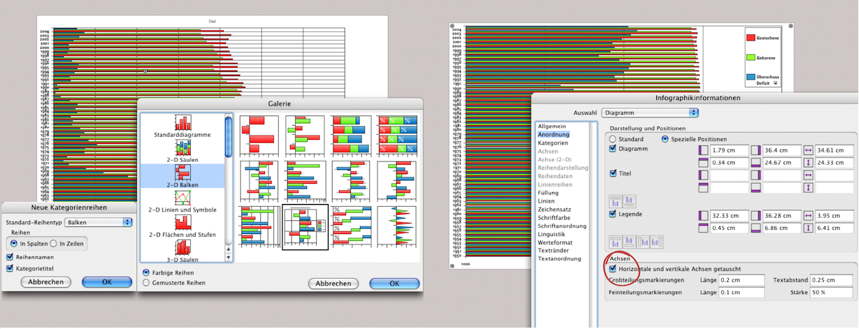 Open a drawing component and then a graph in the drawing component. Select «Graph ➝ Gallery ➝ 2-D Bars». From the gallery, you can either select a graph to which you then need to add additional elements (titles, legends, lines, etc.), or you can select a graph from which you can delete superfluous elements. The second option was chosen here (Fig. 4.23, left). Only excerpts of the data from the spreadsheet are shown in Fig. 4.22. They extend to row 56. (In column D, row 24 shows that the birth surplus changes to a deficit: from 1972 onwards with the so-called “pill slump”. Select the data sets and drag them into the infographic (you can also use copy/paste).