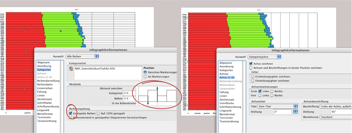 We want to separate the pieces of information even more clearly. To do this, duplicate the graph you just completed: select the graph and drag the mouse while holding down the Option key (Fig. 4.26 left). This creates a completely identical graph and the references to the spreadsheet are retained or transferred. Now separate column D in the spreadsheet into two columns. The new column E contains only the birth deficits, while column E contains only the birth surpluses (Fig. 4.26 right). In the first graph created, column D now only shows the birth surpluses. This first graphic thus becomes the “birth graphic”. Therefore, delete the series of mortality rates from it: select and cut. Similarly, the copied graph should become the “death graph”. There, delete both the series of birth rates and those of birth surpluses. To do this, select your newly created column E with the birth deficits in the spreadsheet and copy it. In Fig. 4.26 on the right, this column has not yet been inserted, but the fill style sheets in the series have already been changed. To ensure that the two graphs are actually opposite each other, the axes of the “mortality graph” must be swapped and their category values made invisible. The y axis also needs to be changed.