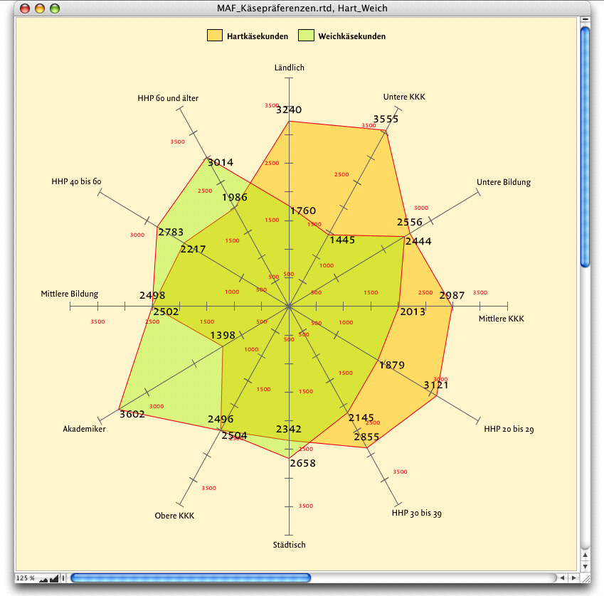 The MFA Institute conducted surveys on preferences for soft cheese and hard cheese. The multi-axis diagram in Fig. 4.28 is useful for highlighting the different profiles. The color transparencies available in RagTime make it easier to show the overlaps. The example graph clearly shows at a glance that soft cheese tends to be purchased more in urban areas, by people in lower purchasing power classes (PPC), and by middle-aged to older heads of households (HOH). The source data from the spreadsheet (see Fig. 4.29) is simple. Creating the diagram is also relatively straightforward.