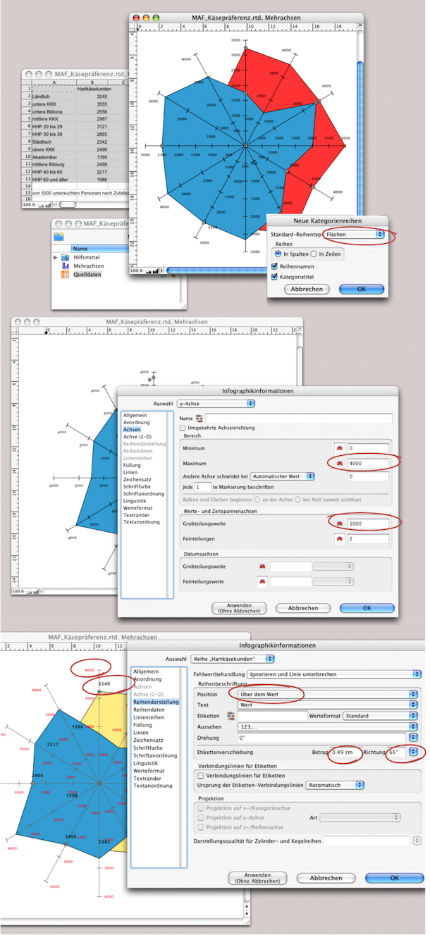 The next steps are just a matter of formatting. Under «Graph Information ➝ Axis ➝ y Axis», enter the maximum value «4000» so that all axes are the same length. On the same panel, under «Lines», we set the black fill to 70% density. Under «Axis (2-D)», make sure that «Axis Drawn» and «Axes and Labels Drawn at Best Positions» are selected. You can then define the font, font size, and font color. Here, we have chosen a smaller font and a red color.