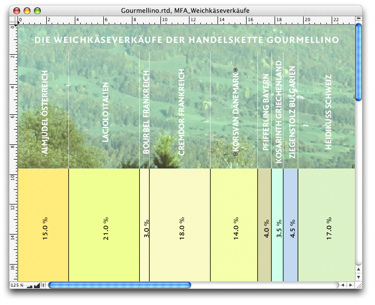 The chart showing the soft cheese sales of a delicatessen chain (see Fig. 4.32) demonstrates that RagTime can also be used to create very simple, modern presentations. The market research institute MFA wanted to use this study and the corresponding presentation to acquire a new customer.