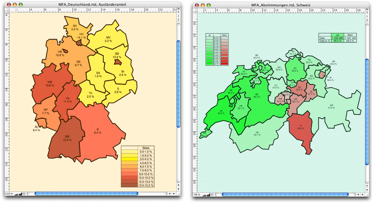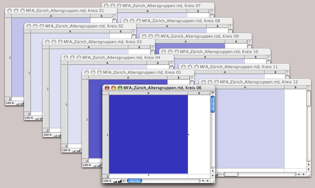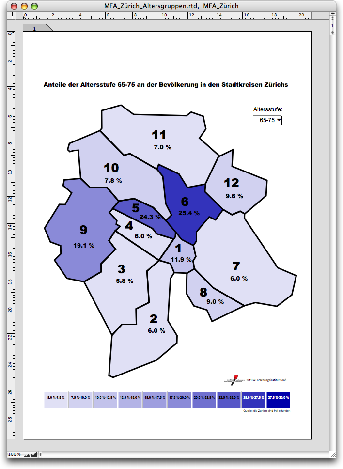 There are dozens of other types of graphs that can be created quite easily with RagTime. In chapter 3 “Ready for print by notes”, Fig. 3.92 we showed the pie chart. In this context, we also pointed out that spreadsheets do not always have to be square and can also be used to create graphs. The two graphics of the German federal states and the Swiss cantons in Fig. 4.36 consist of spreadsheets. If you would like to present statistics for these two countries in this way, take a look at the expert pages of ragtime.de. In the «Beispiele» section, you will find these two documents, which you can adapt to your needs. The individual areas represent value levels using different colors. These are dynamic representations that can be variably “fed” with new data. This is a practical option not only for market research institutes, but also for anyone who wants to graphically represent different facts or changes using a consistent area division. Here we show you step by step how to create such a document. We do this using the example of hypothetical age statistics for the Swiss city of Zurich with its twelve city districts. The procedure remains the same, regardless of what your “statistical area” looks like.