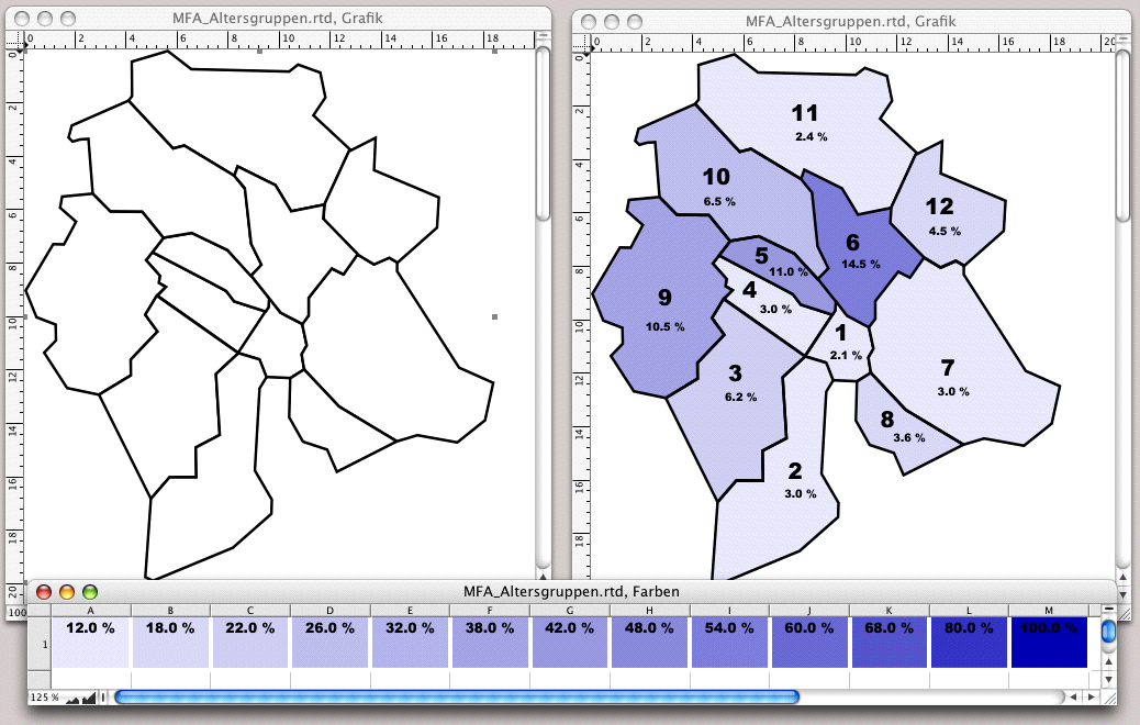 Consider how you want to use the colors. Different colors make differences more apparent. However, shades that differ only in intensity are better suited for representing gradations. We therefore choose the second option here. When choosing colors and color gradations, consider whether the graphic is also to be reproduced in a printing process. If so, avoid colors with a density below 12%. Select colors that will produce good gradation. Fig. 4.38 shows the grouped polygons on the left. The finished graphic – our goal – can be seen in the right-hand drawing component. The spreadsheet below shows a color scale with percentage values for the density of a RagTime RGB color. Only ten levels are normally used for statistical representations. So let's first lay the foundations for our color distribution. To do this, you need to know the maximum dimensions of your subareas or their polygon lines.