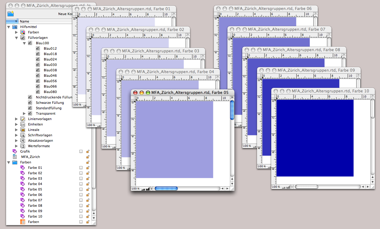 Open a new drawing component and drag a frame from the zero point so that it is large enough to safely enclose the maximum dimensions of all subareas – in our case, 9x9 cm is sufficient. Assign the darkest fill style sheet to the frame and its border. Give this drawing component a name («Color 10») in the Inventory and create a folder called «Colors» there. Now copy the drawing component «Color 10» nine times and rename them «Color 01» to «Color 09». Then open all drawing components and assign the corresponding fill style sheet to each drawing component (Fig. 4.39). In a «Colors» spreadsheet, dimension the ten columns A:J to a width of 18 mm each and the first two rows to a height of 12 mm each. In sequence, drag the drawings «Color 01» to «Color 10» into the cells of row 1. This makes these drawings (i.e., our color scale) referable and can thus be retrieved anywhere as the result of a calculation. At the same time, you have prepared the color scale as a legend. We will come back to this later.
