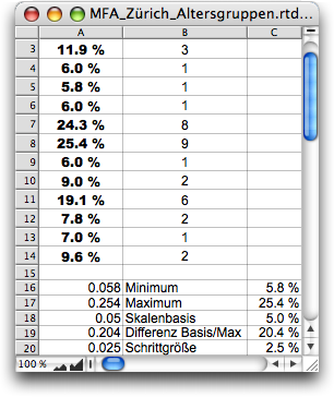 A pop-up menu is used to select the age group whose data is to be displayed. These values are then transferred to a table that is used to calculate the color values. The distribution of the percentages varies depending on the age group. However, an optimal spread of the representation across the color scale should be achieved for each age group. Therefore, the assignment of color levels to percentage values depends on the minimum and maximum values of the selected age group. Before we start implementing the representation, we need to perform the necessary calculations: minimum value and step size of the color scale in relation to the percentage values.