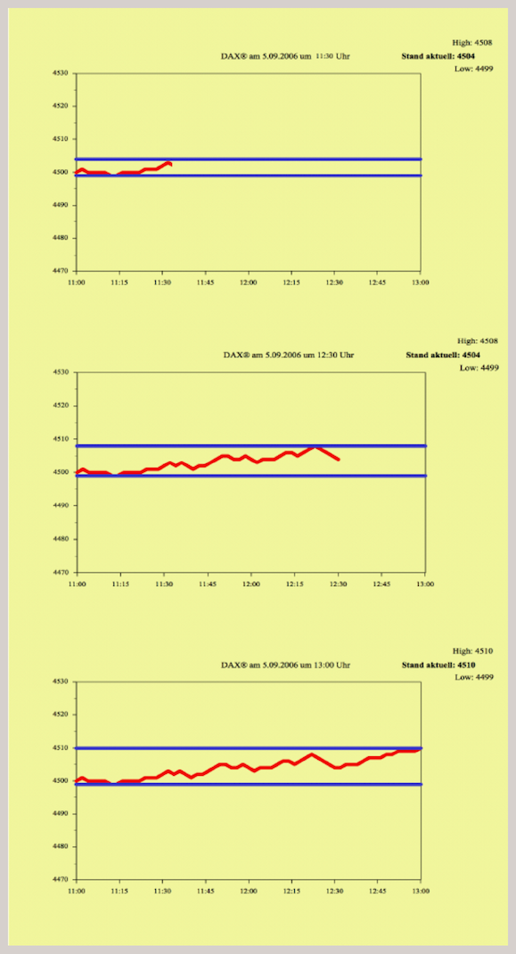 In Fig. 4.11, we have combined two different interaction options in one montage. The graph can first be moved within the container and resized: hold down the mouse button for a longer period of time – the move tool appears as a small hand. At the same time, a line border appears. Now you can move the position. If you drag the handles (the inner dots in the illustration), the graphic will enlarge or reduce in size. If you drag the handles on the actual container border (the outer dots with the X pointer in the illustration), you can “crop” the graph. On the other hand, in our case, the background gradient changes. Depending on the size of the graph frame, the blue of the upper part will fade into the green of the lower part more quickly or more slowly. These are effects that you will need to experiment with. You now have the enlarged section of the graph. Since it is the same graphic (not a copy), this display responds “synchronously” to all color and font settings.
