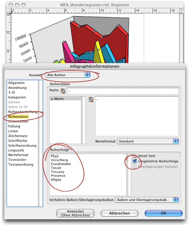 However, you can see at a glance that this representation is not very meaningful. The highest curve obscures all the others behind it. You now have two options: either you sort the rows in the spreadsheet in reverse order or, if the source data cannot be moved for valid reasons, you can change the order in the graph. To do this, open the «Graph Information ➝ Series Data» panel (see Fig. 4.5). Under «Select», both «All Series» and «Reversed Series Order» must be selected with a check mark. Under «Series Ordering», you will see all row titles. Here, you can also manually move the titles and thus the display in the graph individually with the pointer.