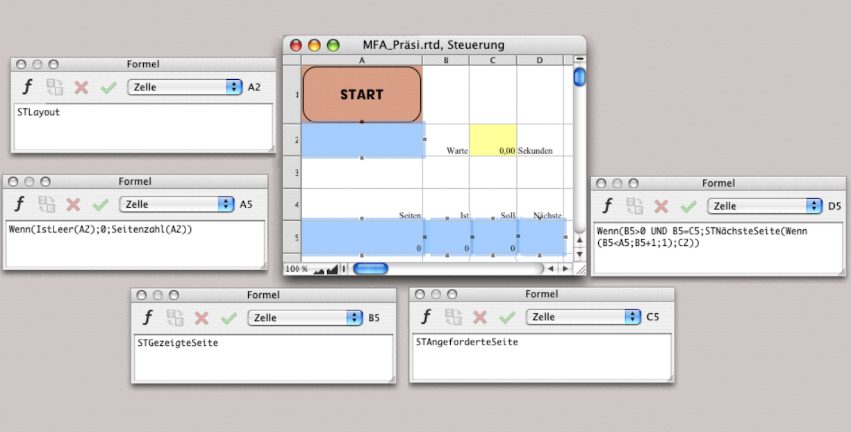 Let's take a closer look at the control formulas: cell A2 displays the name of the layout that is currently running as a slide show. Like all other control commands, you cannot follow this because the functions run in the background while the slide show fills your entire screen.